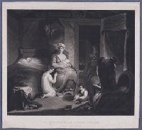 "Inside a cottage, a young mother seated in the centre, suckling a baby; a young girl kneeling in front of her, praying; on left, a bed with a sleeping infant; on right, a cot, and a boy seated on the floor taking off one of his stockings; in backgrou...