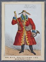 "An imitation of British Museum Satires No. 15733. The Duke of Cumberland, dressed as a guard with broad-brimmed hat, gold-laced greatcoat, pouch or satchel, with breeches and top-boots, holds a cocked blunderbuss by the barrel in his right hand, a co...